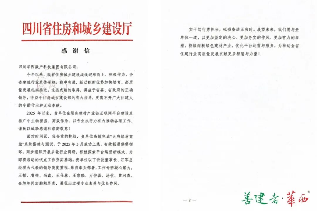感谢信指出,2025年以来,华西数产积极参与“天府绿材商城”系统搭建、测试及上线运营等关键工作,展现出优秀的专业执行力和务实作风。面对时间紧、任务重的挑战,公司高效完成平台开发与测试,并于2025年5月成功上线,有效畅通绿色建材供需循环,为推动行业数字化转型奠定坚实基础。同时,公司主动组织多轮行业调研,积极探索平台可持续运营模式,为后续试点工作提供了有力支撑。